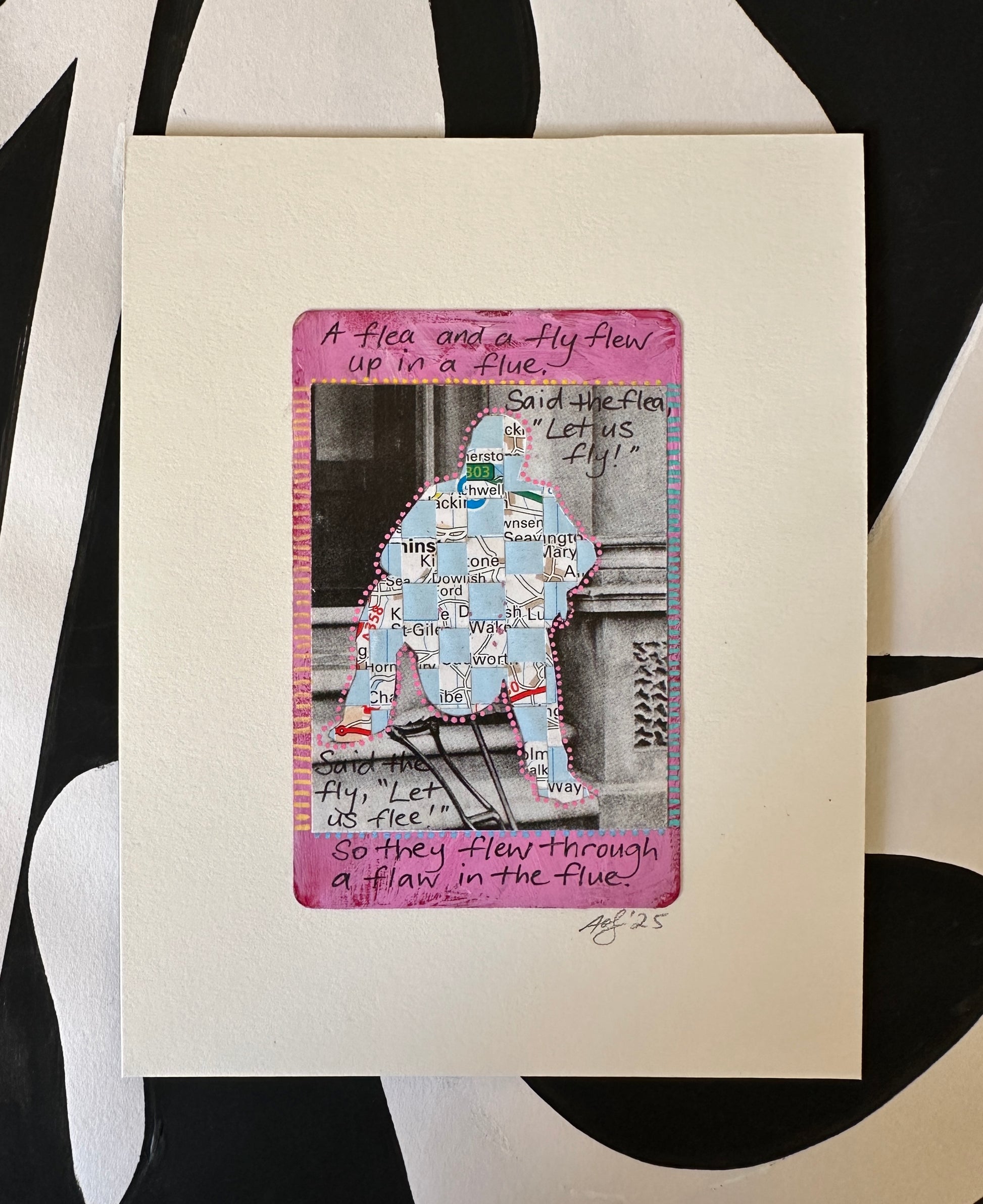 This one-of-a-kind collage layers maps, tongue twisters, and negative space cutouts, woven together with personalised notes and fragments that ensure nothing goes to waste. Its compact size makes it versatile—perfect for any wall, shelf, or gallery arrangement. Intimate in scale yet bold in presence, this small work creates intrigue, sparks conversation, and delivers a powerful impact that belies its size.