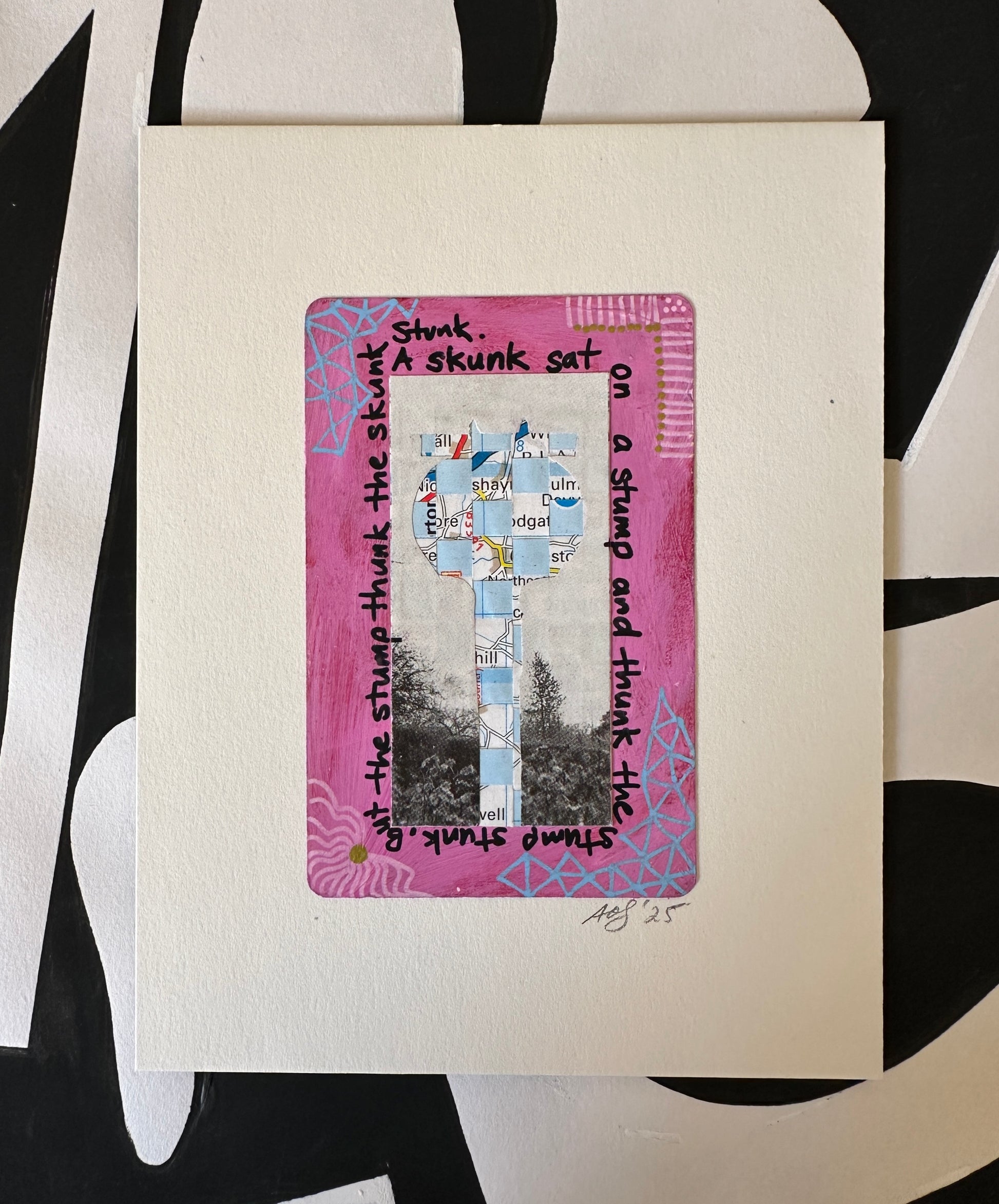 This one-of-a-kind collage layers maps, tongue twisters, and negative space cutouts, woven together with personalised notes and fragments that ensure nothing goes to waste. Its compact size makes it versatile—perfect for any wall, shelf, or gallery arrangement. Intimate in scale yet bold in presence, this small work creates intrigue, sparks conversation, and delivers a powerful impact that belies its size.