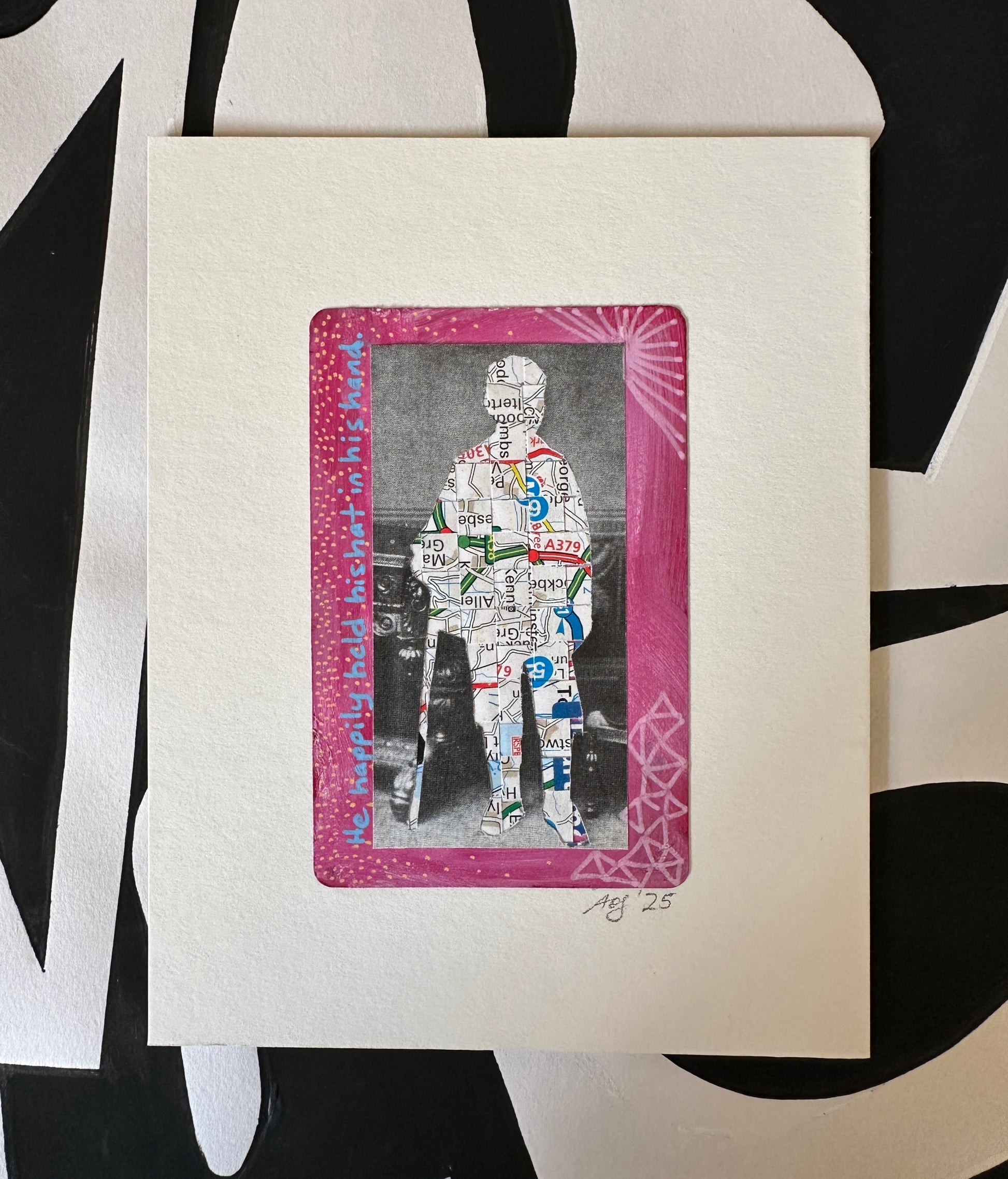 This one-of-a-kind collage layers maps, tongue twisters, and negative space cutouts, woven together with personalised notes and fragments that ensure nothing goes to waste. Its compact size makes it versatile—perfect for any wall, shelf, or gallery arrangement. Intimate in scale yet bold in presence, this small work creates intrigue, sparks conversation, and delivers a powerful impact that belies its size.
