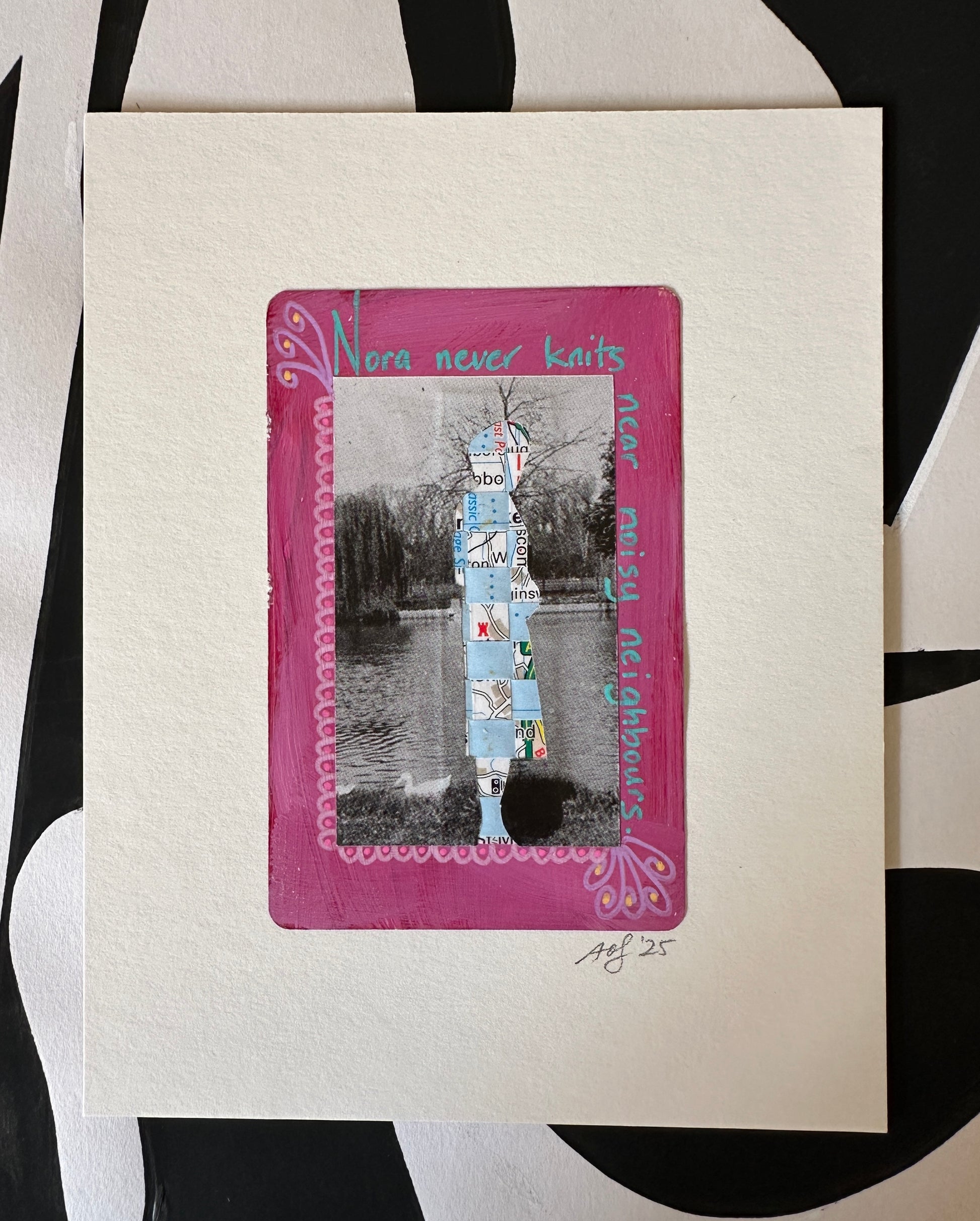 This one-of-a-kind collage layers maps, tongue twisters, and negative space cutouts, woven together with personalised notes and fragments that ensure nothing goes to waste. Its compact size makes it versatile—perfect for any wall, shelf, or gallery arrangement. Intimate in scale yet bold in presence, this small work creates intrigue, sparks conversation, and delivers a powerful impact that belies its size.