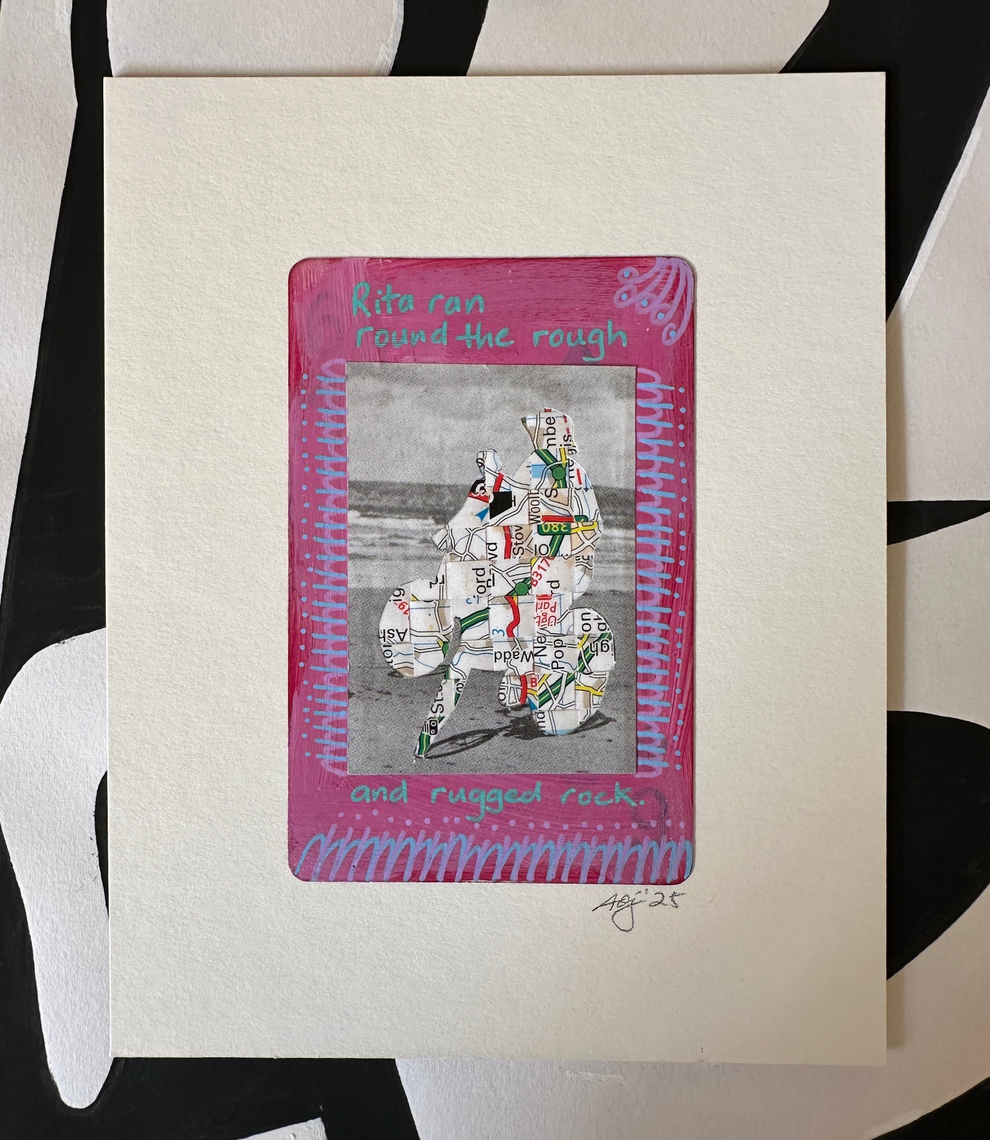 This one-of-a-kind collage layers maps, tongue twisters, and negative space cutouts, woven together with personalised notes and fragments that ensure nothing goes to waste. Its compact size makes it versatile—perfect for any wall, shelf, or gallery arrangement. Intimate in scale yet bold in presence, this small work creates intrigue, sparks conversation, and delivers a powerful impact that belies its size.