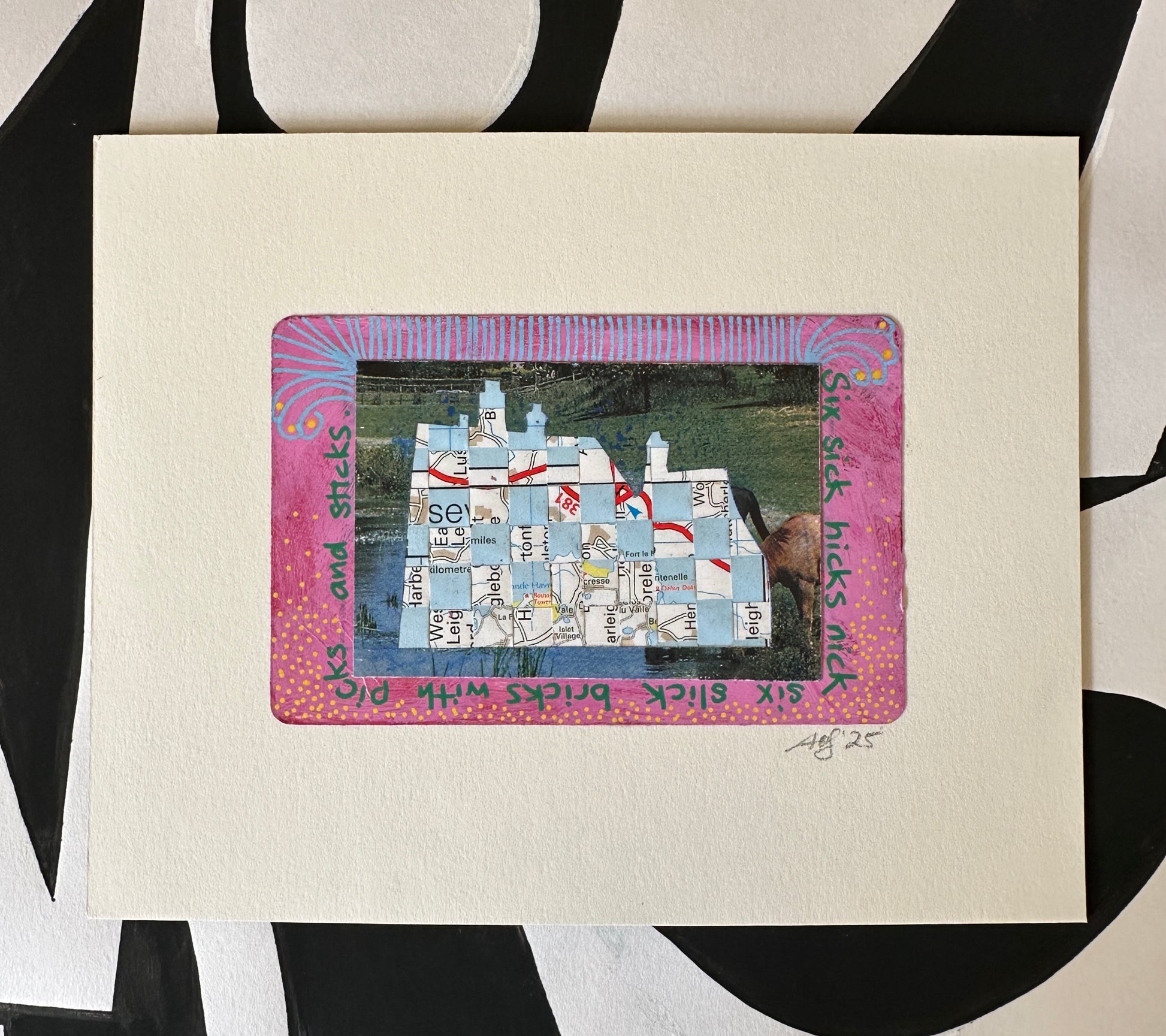 This one-of-a-kind collage layers maps, tongue twisters, and negative space cutouts, woven together with personalised notes and fragments that ensure nothing goes to waste. Its compact size makes it versatile—perfect for any wall, shelf, or gallery arrangement. Intimate in scale yet bold in presence, this small work creates intrigue, sparks conversation, and delivers a powerful impact that belies its size.