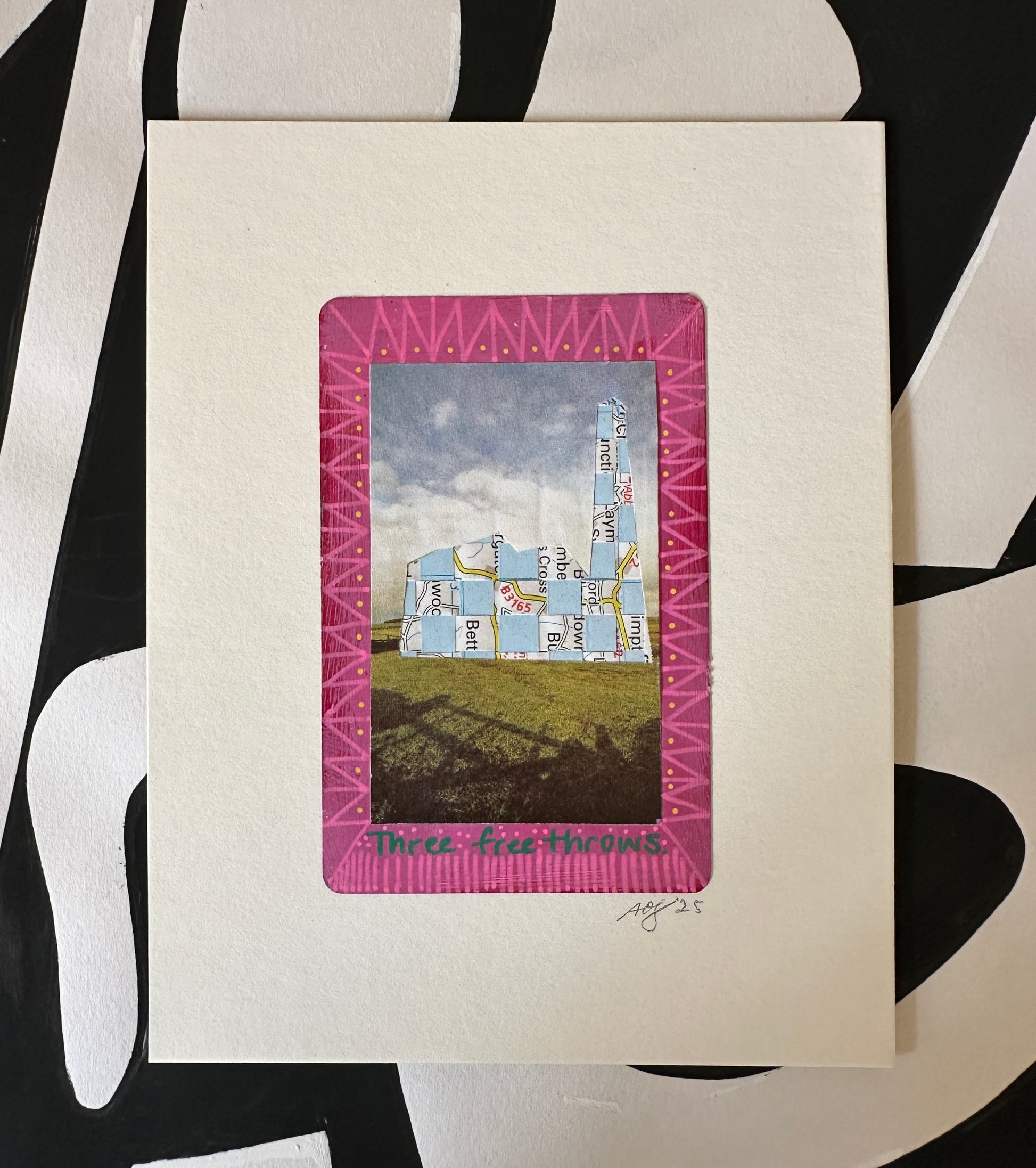 This one-of-a-kind collage layers maps, tongue twisters, and negative space cutouts, woven together with personalised notes and fragments that ensure nothing goes to waste. Its compact size makes it versatile—perfect for any wall, shelf, or gallery arrangement. Intimate in scale yet bold in presence, this small work creates intrigue, sparks conversation, and delivers a powerful impact that belies its size.